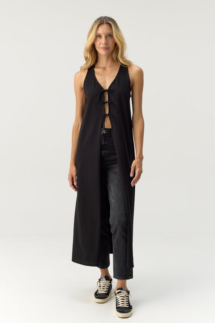 El Isis Kimono Black Onyx redefine la elegancia en su versión más versátil. Su silueta fluida y el detalle de amarres frontales lo convierten en una prenda perfecta para superponer sobre tus active looks o elevar tus outfits casuales. Su color negro profundo añade un toque sofisticado que nunca pasa de moda.